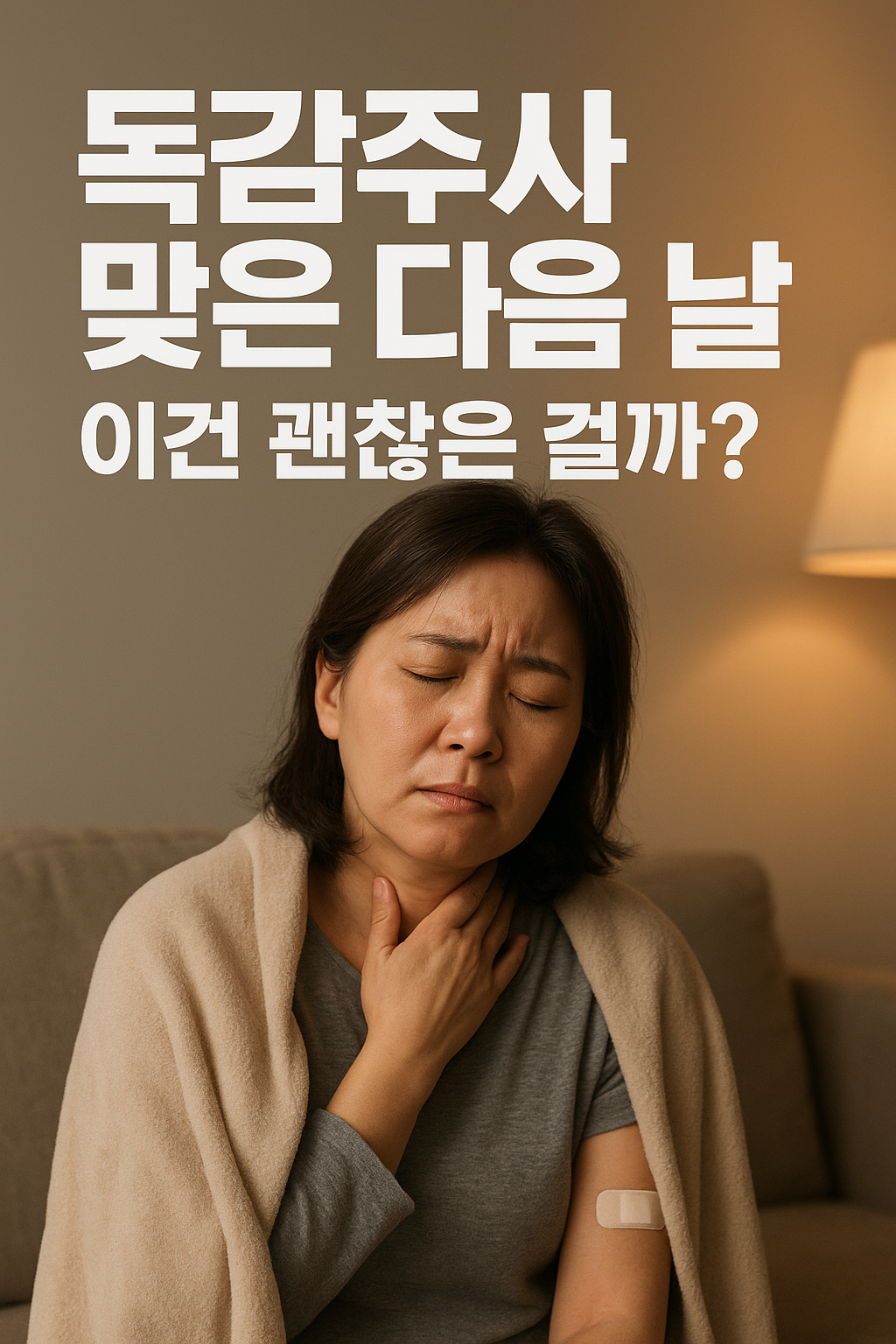 며칠 전 독감 예방주사를 맞았습니다. 처음엔 괜찮았는데 그날 저녁부터 목에 이물감이 느껴지더니, 다음 날엔 침 삼키기도 힘들고 몸이 늘어지는 느낌, 무기력감과 근육이 처지는 것 같은 증상이 왔습니다.